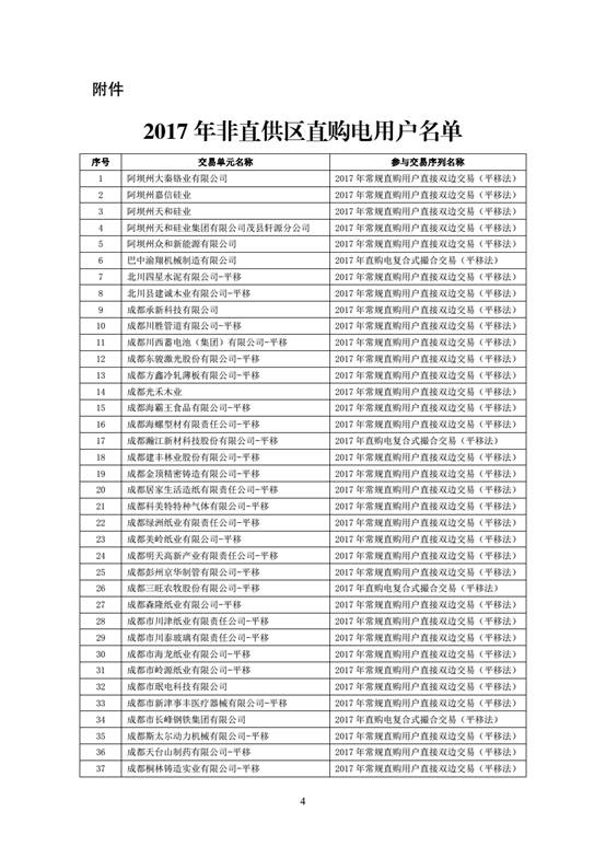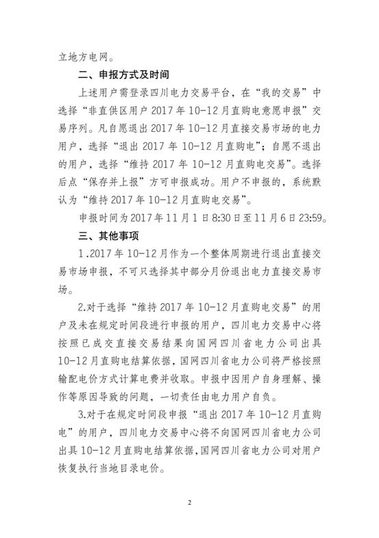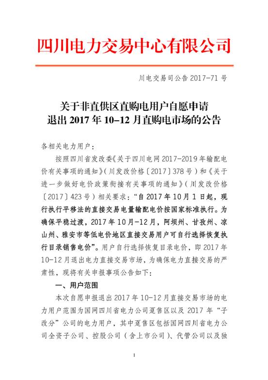 四川發(fā)布《關(guān)于非直供區(qū)直購電用戶自愿申請退出2017年10至12月直購電市場的公告》
