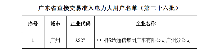 廣東省經(jīng)信委日前發(fā)布了第三十六批直接交易準入電力大用戶名單,認定中國移動通信集團廣東有限公司廣州分公司電力大用戶符合與發(fā)電企業(yè)直接交易擴大試點準入條件,詳情如下: