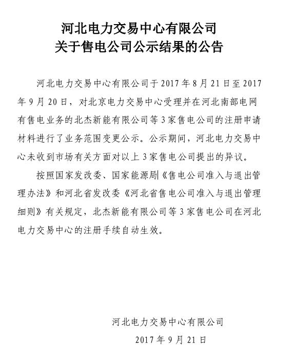 2017年9月21日,河北電力交易中心公布3家業(yè)務(wù)范圍變更的售電公司公示結(jié)果。2017年8月21日至2017年9月20日,河北電力交易中心有限公司對(duì)北京電力交易中心受理并在河北南部電網(wǎng)有售電業(yè)務(wù)的北杰新能有限公司等3家售