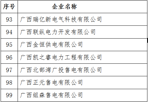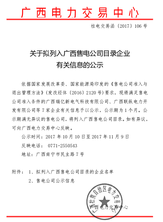 2017年10月10日,廣西電力交易中心發(fā)布《關(guān)于擬列入廣西售電公司目錄企業(yè)有關(guān)信息的公示》。將滿足售電公司準(zhǔn)入條件的廣西瑞億新電氣科技有限公司、廣西聯(lián)縱電力開(kāi)發(fā)有限公司等7家企業(yè)有關(guān)信息予以公示,公示期為