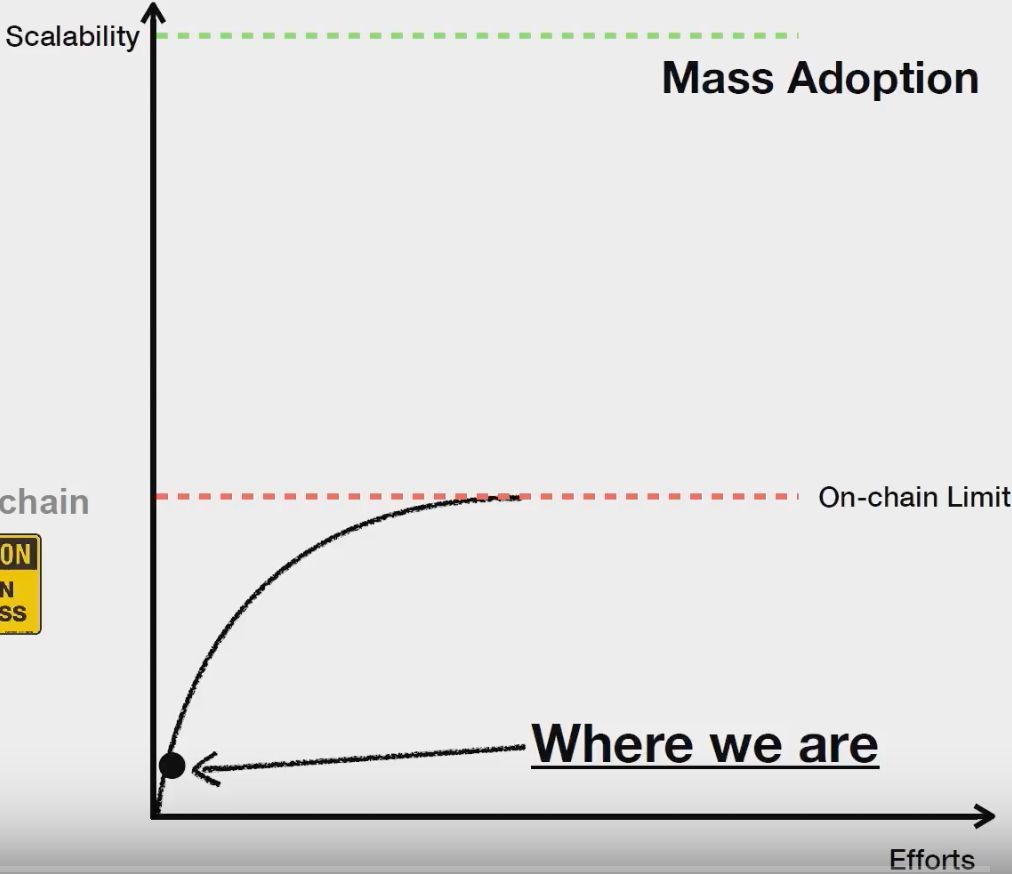但正如這張圖顯示的,如果我們只關(guān)注 on-chain limit 的話,發(fā)展到一定程度后,我們的收益是遞減的。說(shuō)到底,區(qū)塊鏈仍然是關(guān)于 “如何取得共識(shí)” 的一致性算法,而一致性算法不可避免地會(huì)遇到效率問(wèn)題。如果說(shuō)區(qū)塊鏈技術(shù)大規(guī)模普及所要求的速度是最上面那根綠色的線的話,以現(xiàn)有方式的可擴(kuò)展性是無(wú)法達(dá)到的。