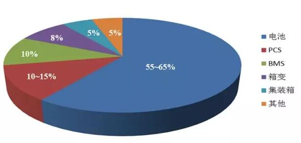 儲能系統(tǒng)的構(gòu)成主要包括電池單元,電池管理系統(tǒng)(BMS)、能量轉(zhuǎn)換系統(tǒng)(PCS),中央控制系統(tǒng)。儲能系統(tǒng)由儲能變流器(PCS)、蓄電池儲能單元、蓄電池管理系統(tǒng)(BMS)和預(yù)裝式集裝箱組成。各單元投資比例如下: