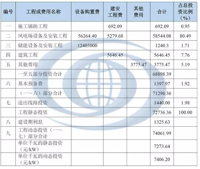 以青海某100MW風(fēng)電場為例,配備4MWh儲能設(shè)備,投資指標(biāo)如下: