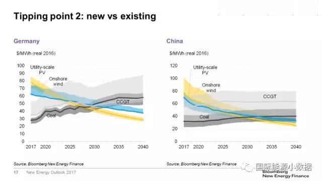 第一個(gè)臨界點(diǎn)是:在沒有補(bǔ)貼的情況下,新建風(fēng)電、光伏電站發(fā)電成本可與新建煤電、天然氣電站競(jìng)爭(zhēng)。在目前的市場(chǎng)條件下,在很多國(guó)家已經(jīng)接近這一臨界點(diǎn)。在德國(guó),新建陸上風(fēng)電的發(fā)電成本已經(jīng)低于煤電、天然氣發(fā)電;在中國(guó),目前煤電成本在各類電源中依然是最低的,但是預(yù)期2019年陸上風(fēng)電成本將低于煤電、2021年光伏成本也將低于煤電;在美國(guó),天然氣發(fā)電是各類電源中成本最低的,但預(yù)計(jì)2022-2023年風(fēng)電、光伏成本均將低于天然氣發(fā)電;在印度,預(yù)計(jì)2020年起新建光伏將在全國(guó)范圍內(nèi)低于煤電。