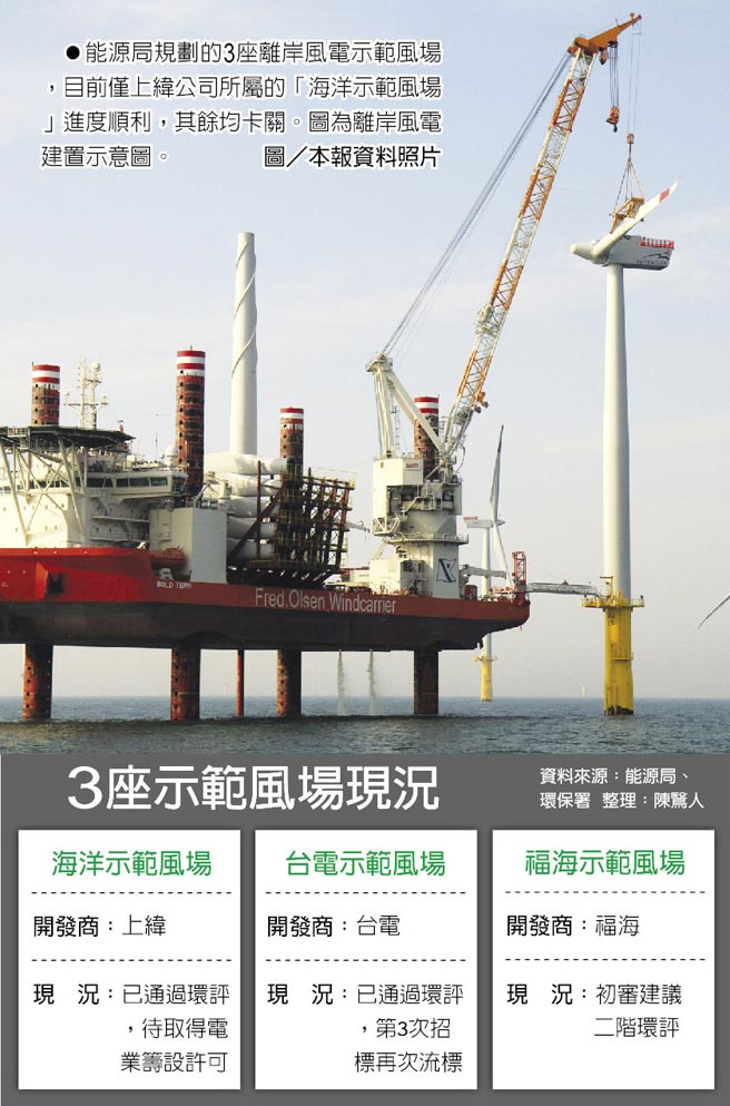 能源局規(guī)劃的3座離岸風(fēng)電示范風(fēng)場,目前僅上緯公司所屬的「海洋示范風(fēng)場」進度順利,其余均卡關(guān)。圖為離岸風(fēng)電建置示意圖。圖/本報資料照片 3座示范風(fēng)場現(xiàn)況