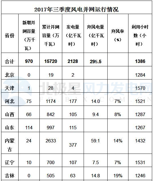 2017年三季度風電并網(wǎng)運行情況