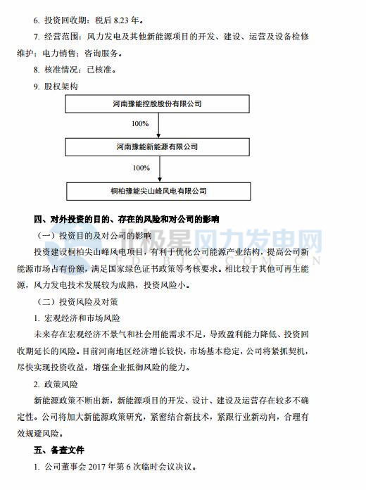 河南豫能控股股份有限公司12 月 26 日召開董事會 2017 年第 6 次臨時 會議,審議通過了《關(guān)于投資建設桐柏尖山峰風電項目的議案》,決定出資設立桐柏豫能尖山峰風電有限公司,持股比例 100%,投資建設桐柏尖山峰風電項目,該項目裝機規(guī)模50MW,注冊資本5000 萬元,項目總投資 達到3.72 億元。以下是會議原文: