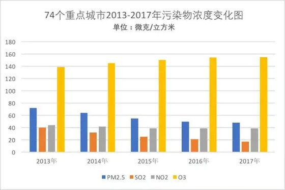 與全國的臭氧濃度增加的趨勢相一致,2017年的74個重點城市臭氧平均濃度值為155微克/立方米,比2013年增加了11.5%,其中32個城市超過國家二級標準(160微克/立方米)。53個城市出現臭氧污染加劇的現象,其中湖州、邢臺、肇慶、太原、哈爾濱、廈門市的同比上升幅度達到30%以上。