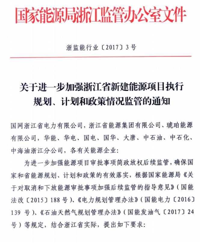 1月9日,國家能源局浙江監(jiān)管辦公開發(fā)布《關(guān)于進(jìn)一步加強(qiáng)浙江省新建能源項目執(zhí)行規(guī)劃、計劃和政策情況監(jiān)管的通知》,《通知》要求,浙江省新