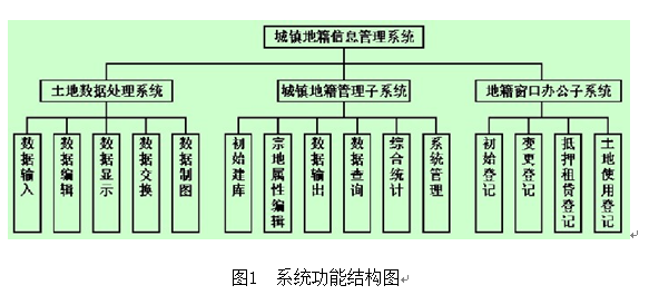 在城鎮(zhèn)地籍?dāng)?shù)據(jù)建庫中加強(qiáng)對空間拓?fù)涞氖褂镁哂兄匾饔?。加?qiáng)拓?fù)涞氖褂?,可以全面掌握包括土地使用、分配及土地之間的相互關(guān)系等土地情況。同時(shí)拓?fù)涫羌訌?qiáng)地理要素空間聯(lián)系的關(guān)鍵,主要表現(xiàn)在其強(qiáng)大的數(shù)據(jù)分析處理方面,通過對其的使用,可以為城鎮(zhèn)地基數(shù)據(jù)建庫工作者們提供優(yōu)質(zhì)的地籍空間數(shù)據(jù)信息,加強(qiáng)他們對地基數(shù)據(jù)信息資源的分析使用能力。通過ArcGis平臺提供的空間數(shù)據(jù)處理拓?fù)涔ぞ?,城?zhèn)地籍?dāng)?shù)據(jù)建庫工作者們可以根據(jù)實(shí)際需求,建立空間地籍?dāng)?shù)據(jù)拓?fù)湟?guī)則,并對空間數(shù)據(jù)信息和圖形屬性進(jìn)行分析,及時(shí)檢查出空間關(guān)系出現(xiàn)的錯(cuò)誤。目前我國城鎮(zhèn)地籍?dāng)?shù)據(jù)建庫工作中普遍采用ArcGis平臺。城鎮(zhèn)地籍信息管理系統(tǒng)主要使用的是GIS數(shù)據(jù)處理系統(tǒng),在對空間數(shù)據(jù)進(jìn)行處理時(shí),重點(diǎn)對其中的宗地進(jìn)行研究,以滿足城鎮(zhèn)居民土地使用中的登記業(yè)務(wù),在這一過程中,還建立了相應(yīng)的地籍辦公子系統(tǒng)。在ArcGis平臺信息管理系統(tǒng)中,管理內(nèi)容主要為城鎮(zhèn)地籍信息的管理子系統(tǒng)、城鎮(zhèn)土地?cái)?shù)據(jù)的處理子系統(tǒng)和地籍窗口辦公子系統(tǒng)等。系統(tǒng)功能結(jié)構(gòu)如下圖1所示。