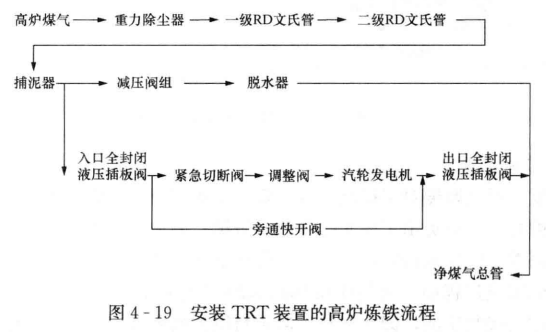 (1)高爐煤氣余壓發(fā)電(TRT)。TRT技術,是國際公認的鋼鐵企業(yè)重大能量回收裝置。現(xiàn)代高爐爐頂壓力高達0.15~0.25MPa,溫度約200℃,因而爐頂煤氣中存在有大量物理能。TRT發(fā)電裝置是利用高爐爐頂煤氣的壓力和溫度,推動汽輪機旋轉做功,驅動發(fā)電機發(fā)電的裝置,如圖4-19所示。TRT裝置包括汽輪機和發(fā)電機兩大部分,在煤氣減壓閥前把煤氣引入膨脹機,把壓力能和熱能轉化為機械能并驅動發(fā)電機發(fā)電。在運行良好的情況下,噸鐵回收電力約30~54kWh,可滿足高爐鼓風機電耗的30%,實質上回收了原來在減壓閥中浪費的能量。如果高爐煤氣采用干法除塵,發(fā)電量還可以增加30%左右。