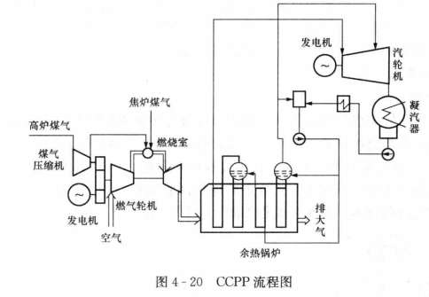 (3)高爐燃氣——蒸汽聯(lián)合循環(huán)發(fā)電(CCPP)。低熱值煤氣燃氣輪機聯(lián)合循環(huán)發(fā)電技術是將煤氣與空氣壓縮到1.5~2.2MPa,在壓力燃燒室內燃燒,高溫高壓煙氣直接在燃氣透平(GT)內膨脹做功并帶動空氣壓縮機(AC)與發(fā)電機(GE)完成燃機的單循環(huán)發(fā)電。燃氣透平攤出煙氣溫度一般可在500℃以上,余熱利用可提高系統(tǒng)效率,再用余熱鍋爐(HRSG)生產中壓蒸汽,并用蒸汽輪機(ST)發(fā)電。蒸汽輪機發(fā)電是燃機發(fā)電的補充,并完成聯(lián)合循環(huán)。CCPP的鍋爐和汽輪機都可以外供蒸汽,聯(lián)合循環(huán)可以靈活組成熱電聯(lián)產的工廠。在CCPP系統(tǒng)中還有一個煤氣壓縮機(GC)單元,特別在低熱值煤氣發(fā)電中,煤氣壓縮機比較大。眾所周知,余熱鍋爐加蒸汽輪機發(fā)電是常規(guī)技術,所以CCPP技術核心是燃氣輪機,燃氣輪機一般是透平空氣壓縮機、燃燒器與燃氣透平機組合的總稱(CCPP),總的熱效率能提高到43%~46%。CCPP裝置由于具有效率高、造價低、省水、建設周期短、啟動快等一系列優(yōu)點,在世界各國電力行業(yè)中應用相當廣泛。CCPP流程圖如圖4-20所示。