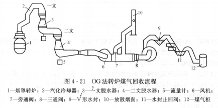 氣110~120rT13,所含熱量幾乎占到整個煉鋼過程放熱量的80%,其回收利用將有利于降低能源消耗。濕式除塵法是以雙級文氏管為主的煤氣回收流程(簡稱OG法),同時也是國內發(fā)展較快且較為成熟的技術,其工藝流程加圖4-21所示。