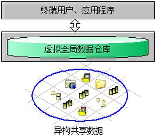 挑戰(zhàn)的解決方案,它提供了一種基礎(chǔ)設(shè)施,允許安全地訪問任何信息源,而不需要關(guān)注其位置和數(shù)據(jù)的類型。網(wǎng)格的信息基礎(chǔ)設(shè)施是訪問異質(zhì)文件、數(shù)據(jù)庫、存儲系統(tǒng)等的基礎(chǔ)設(shè)施,并支持在計(jì)算處理和大規(guī)模協(xié)作過程中實(shí)現(xiàn)數(shù)據(jù)共享。這樣的基礎(chǔ)設(shè)施允許對跨越異質(zhì)硬件和軟件資源的數(shù)據(jù)庫、文件、存儲設(shè)備等進(jìn)行管理。這樣需要首先將數(shù)據(jù)虛擬化。從訪問的角度來說,一種數(shù)據(jù)大致可以用三個特征來描述,即數(shù)據(jù)(元數(shù)據(jù))、文件系統(tǒng)和儲存介質(zhì)(以及位置),因此,虛擬數(shù)據(jù)庫涉及三個層次的虛擬化,即數(shù)據(jù)的虛擬化、文件系統(tǒng)的虛擬化和存儲介質(zhì)的虛擬化。這樣,最終為用戶提供一個巨大的全局虛擬數(shù)據(jù)倉庫供訪問,如圖 5所示。