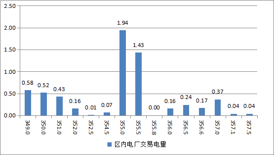 冀北統(tǒng)調(diào)15家發(fā)電企業(yè)參與交易,成交均價(jià)為355.53元/千千瓦時(shí),成交價(jià)最高為357.50元/千千瓦時(shí),成交價(jià)最低為349.00元/千千瓦時(shí)。區(qū)內(nèi)電廠(含張家口電廠、王灘電廠)成交電量電價(jià)區(qū)間如下: