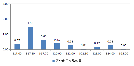 區(qū)外11家發(fā)電企業(yè)參與交易,成交均價(jià)為318.98元/千千瓦時(shí),成交價(jià)最高為325.00元/千千瓦時(shí),成交價(jià)最低為317.00元/千千瓦時(shí)。區(qū)外電廠成交電量電價(jià)區(qū)間如下: