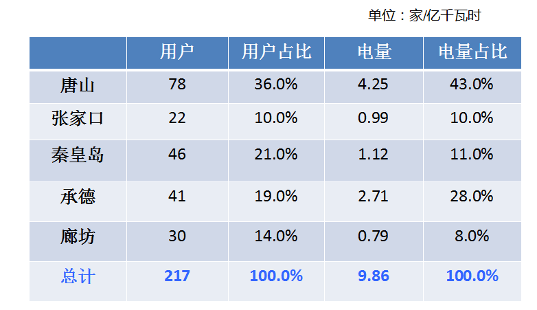 冀北地區(qū)準(zhǔn)入電力用戶227家,本次交易217家參與,10家未參與。參與交易的347個(gè)用電單元地區(qū)分布及電壓等級(jí)情況如下。