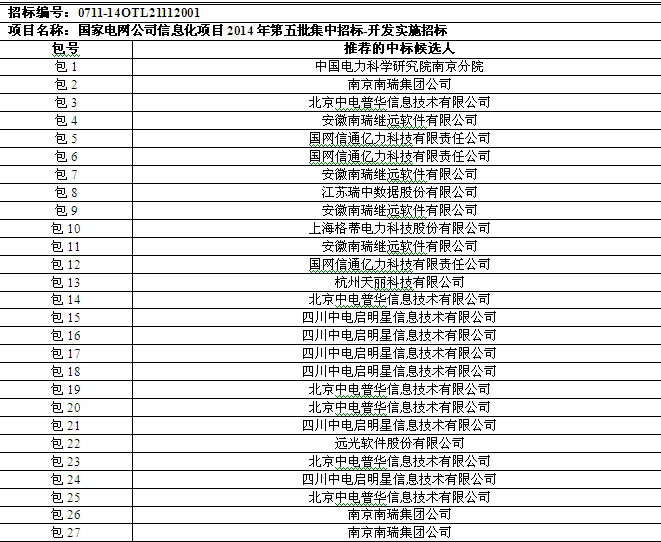 國家電網(wǎng)信息化項目2014年第五批(調(diào)度集成及軟件)中標候選人公示