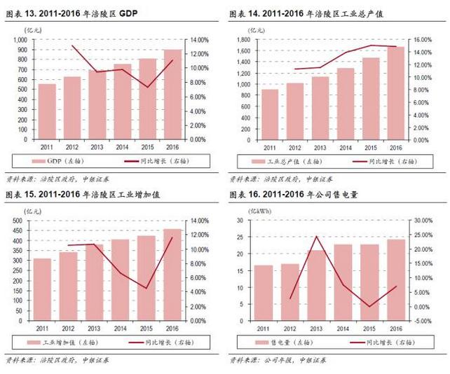 公司近年售電量與售電收入穩(wěn)中有升:公司2016年售電量達(dá)到24.31億kWh,售電收入12.36億元,近六年CAGR分別為7.98%和9.04%,趨勢與涪陵區(qū)地區(qū)生產(chǎn)總值及工業(yè)增加值近五年的變化趨勢相仿,體現(xiàn)了主營業(yè)務(wù)對供電地區(qū)經(jīng)濟(jì)發(fā)展尤其是工業(yè)發(fā)展的依賴。