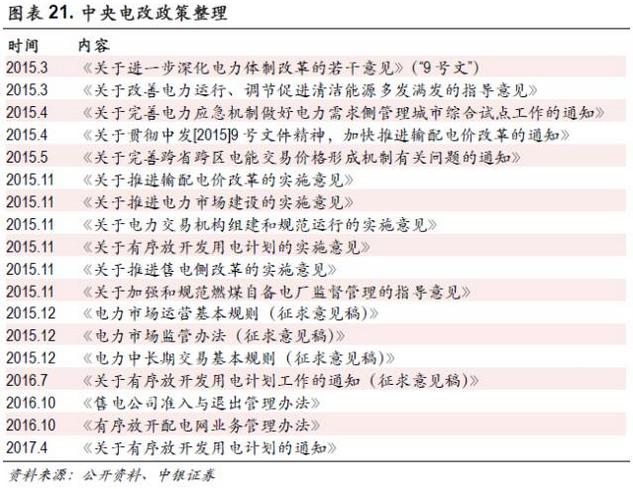 2015年3月15日,國務(wù)院發(fā)布《關(guān)于進(jìn)一步深化電力體制改革的若干意見(中發(fā)〔2015〕9號文)》,正式拉開第二輪電力體制改革的大幕。目前第二輪電改已初步形成了“綱領(lǐng)文件—頂層設(shè)計(jì)—落地規(guī)則”三個層次的政策體系。在近期配套文件《售電公司準(zhǔn)入與退出管理辦法》、《有序放開配電業(yè)務(wù)管理辦法》下發(fā)之后,《國家發(fā)改委、國家能源局關(guān)于有序放開發(fā)用電計(jì)劃的通知》也于近日正式下發(fā)。本輪電改的政策體系已經(jīng)搭建完整。