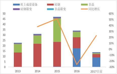 隨著配電網(wǎng)投資的興起,配電設(shè)備以及相關(guān)電力工程勘察設(shè)計(jì)行業(yè)在“十三五”期間將保持高速增長(zhǎng)。其中,配電變壓器是配電網(wǎng)的核心設(shè)備之一,在2015年國(guó)網(wǎng)招標(biāo)規(guī)模迎來高峰,達(dá)到47萬臺(tái)。2016年,由于國(guó)網(wǎng)人事調(diào)整等原因,變壓器招標(biāo)規(guī)模下降到35萬臺(tái)以下,但從2017年第一批配電網(wǎng)招標(biāo)來看,規(guī)模較去年同比上升約23%,行業(yè)出現(xiàn)了顯著回暖跡象,預(yù)計(jì)未來幾年有望保持穩(wěn)定增長(zhǎng),尤其是農(nóng)網(wǎng)領(lǐng)域的改造升級(jí)。