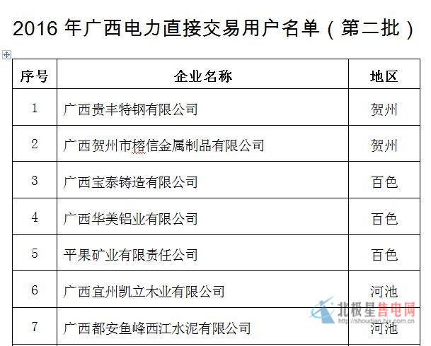 廣西壯族自治區(qū)工業(yè)和信息化委關(guān)于2016年電力直接交易準(zhǔn)入名單(第二批)的公示