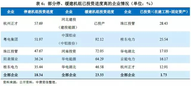 停、緩建項目已投資進(jìn)度及影響程度整體偏低,但其中不乏已投產(chǎn)、已投資進(jìn)度高于50%及已投資金額占在建工程及固定資產(chǎn)總值比例超過20%的企業(yè)。本批停、緩建項目平均投資進(jìn)度均偏低(分別僅18.34%與23.33%),項目對涉及企業(yè)影響程度亦很低(僅1.73%)。但杭州正才、粵電集團(tuán)停建項目已投資進(jìn)度超過50%;河北建投(建投能源)緩建項目已并網(wǎng)發(fā)電;中國鋁業(yè)(中鋁股份)、河南投資、華電能源緩建項目已投資進(jìn)度超過50%,上述項目或造成較大規(guī)模的資金占用。此外,珠江投管、桂東電力已投資金額占在建工程及固定資產(chǎn)總值比例超過20%,將對企業(yè)戰(zhàn)略規(guī)劃及發(fā)展布局形成較大影響。根據(jù)文件要求,本批停建、緩建項目需至少推遲至“十四五”及以后并網(wǎng),需關(guān)注投資規(guī)模大、投資進(jìn)度高的企業(yè)對相關(guān)項目的處置情況。