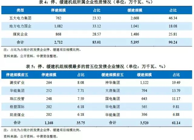 涉及停建的項目共33個,裝機(jī)規(guī)模共4,172萬千瓦,涉及30個發(fā)債企業(yè),已投資超過247億元;涉及緩建的項目共62個,裝機(jī)規(guī)模共6,331萬千瓦,涉及38個發(fā)債企業(yè),已投資超過584億元。