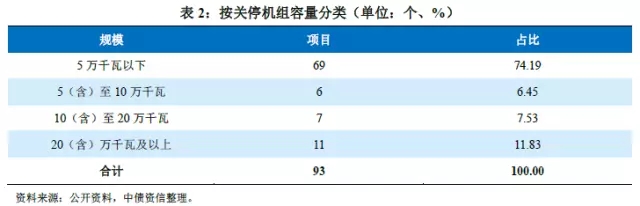 關(guān)停項目以5萬千瓦以下的小規(guī)模機(jī)組為主。按關(guān)停機(jī)組容量來看,93臺機(jī)組中72.04%(67臺)的機(jī)組裝機(jī)規(guī)模不足5萬千瓦,僅平頂山姚孟發(fā)電廠(國電投集團(tuán),31萬千瓦)、華電六安電廠(27萬千瓦)、北京熱電廠(華能集團(tuán),2*22萬千瓦)、天津軍糧城電廠(華電集團(tuán),4*20萬千瓦)、太二電廠(大唐集團(tuán),2*20萬千瓦)、黃石熱電廠(華電集團(tuán),20萬千瓦)為20萬千瓦及以上機(jī)組。