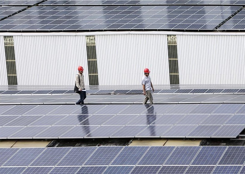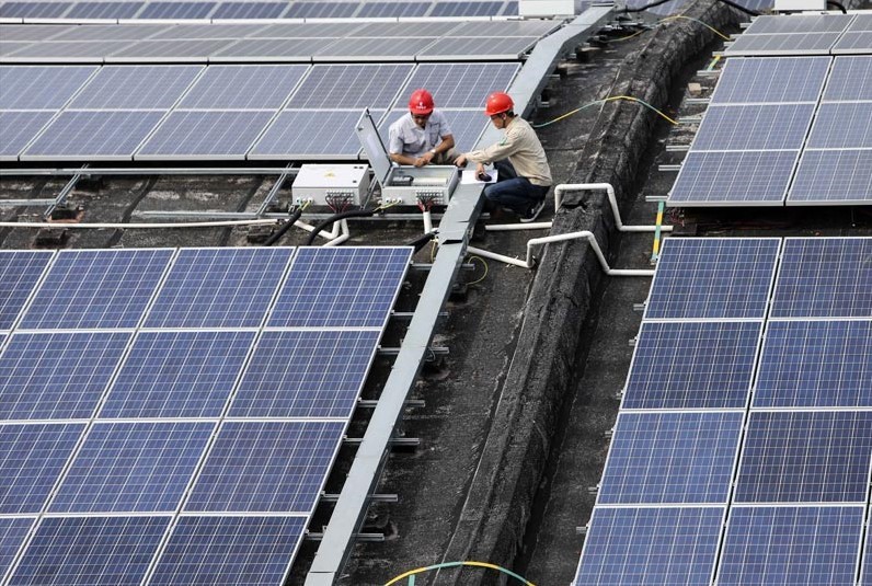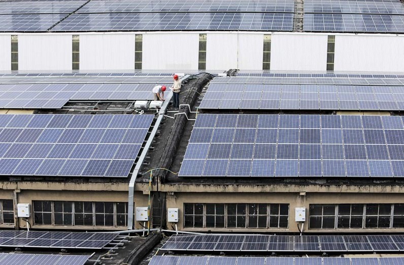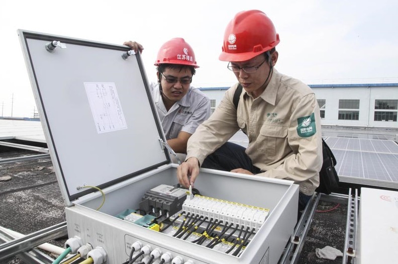 8月23日,江蘇常州新北區(qū)工業(yè)廠房屋頂10MW光伏發(fā)電項(xiàng)目正式并網(wǎng)運(yùn)行。截止2013年8月該公司已受理分布式光伏發(fā)電項(xiàng)目18個(gè),總?cè)萘?420.56378MW。已完成并網(wǎng)容量44MW,,其中全部并網(wǎng)項(xiàng)目10個(gè),并網(wǎng)容量為34.7MW;部分并網(wǎng)項(xiàng)目3個(gè),并網(wǎng)總?cè)萘?.3MW。圖為:8月23日,該公司工作人員對(duì)江蘇常州新北區(qū)工業(yè)廠房屋頂10MW光伏發(fā)電項(xiàng)目進(jìn)行并網(wǎng)前調(diào)試檢查。