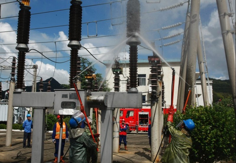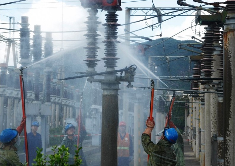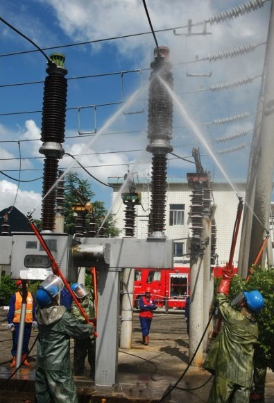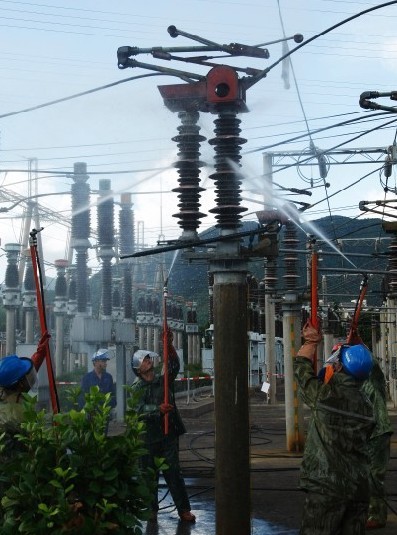 “打開噴頭,往上走,往下走……”一連串的指令在電力設(shè)備清洗監(jiān)護(hù)員的口中喊出。昨天下午,在110千伏定海城西變電所內(nèi)發(fā)生了一件神奇的事情,一群身著綠色厚厚雨衣,頭戴頭盔,手持長長噴水管的人,四人一小組,圍著一個高壓斷路器上的絕緣子進(jìn)行沖洗,而一旁的變壓器還在發(fā)出“嗡嗡”的響聲,這是我市首次對變電站進(jìn)行帶電沖洗作業(yè)。