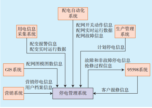 為實(shí)現(xiàn)配電網(wǎng)日常生產(chǎn)管理、停電研判與搶修指揮等功能,停電管理系統(tǒng)實(shí)現(xiàn)了與配電自動(dòng)化系統(tǒng)、用電信息采集系統(tǒng)、生產(chǎn)管理系統(tǒng)、95598系統(tǒng)、營銷系統(tǒng)、GIS等系統(tǒng)的數(shù)據(jù)接口[14]。系統(tǒng)集成架構(gòu)如