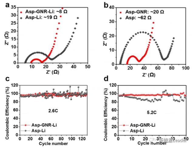 在上述實驗中很重要的一點是TuoWang在多孔碳材料Asp中添加了石墨烯納米帶GNRs材料作為導電劑,以增強Asp材料的導電性,這一點在低倍率(0.65C和1.3C)下并不明顯,但是在較高的倍率下(2.6C圖c,5.2C圖d)就能觀察到較明顯的差距,特別是在5.2C倍率下,僅僅循環(huán)15次左右就能在庫倫效率上觀察到明顯的區(qū)別。通過SEM研究發(fā)現(xiàn),在5.2C大倍率下,沒有添加GNRs的負極材料的表層出現(xiàn)了金屬Li枝晶,而在添加了GNRs的電極上則沒有觀察到這一現(xiàn)象。