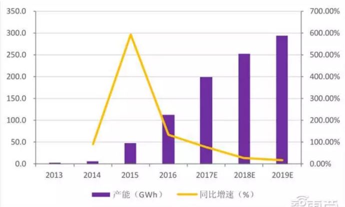據(jù)中國化學(xué)與物理電源行業(yè)協(xié)會統(tǒng)計,2016 年年底中國動力電池產(chǎn)能為 101 3GWh,預(yù)計到 2019 年有望超過 300GWh,動力電池產(chǎn)能大幅提升。新能源汽車目前仍處導(dǎo)入期,但已經(jīng)是全球大趨勢,世界主要工業(yè)國均出