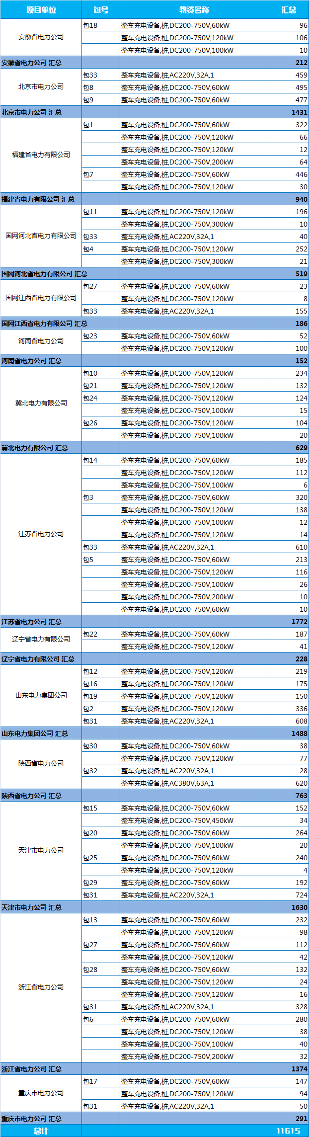近日國(guó)家電網(wǎng)公司發(fā)布了2018年第一批充電樁招標(biāo),共計(jì)招標(biāo)交、直流充電設(shè)備11615臺(tái),直流充電設(shè)備7993臺(tái)、交流充電設(shè)備3622臺(tái)。本次招標(biāo)國(guó)
