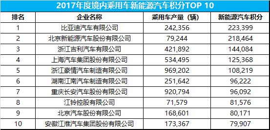 2017年乘用車雙積分公布 新能源汽車積分比亞迪居首北汽新能源次席