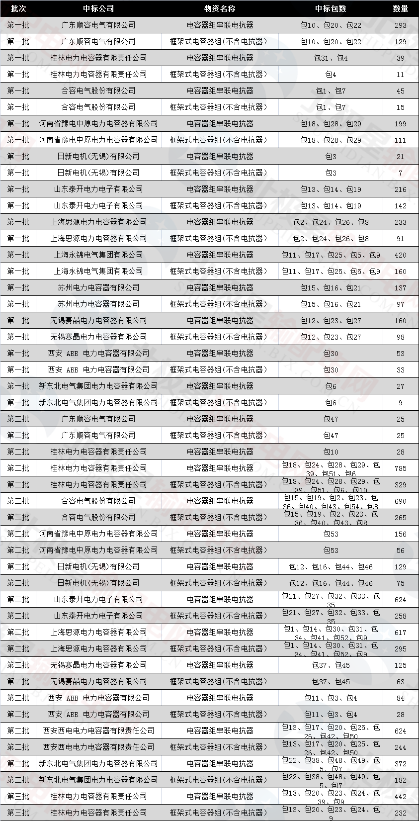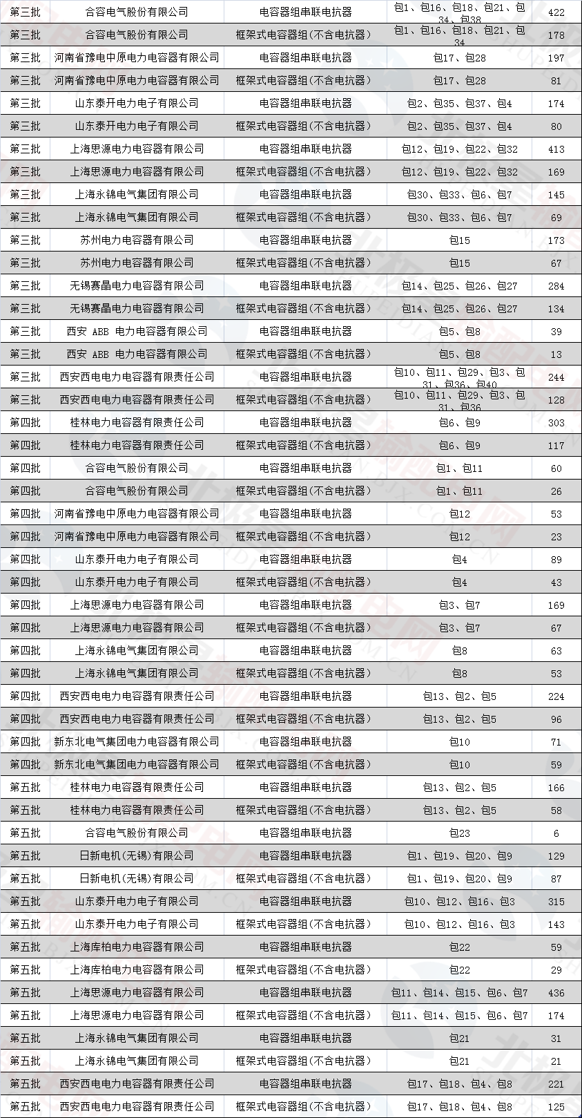 在前五次招標中,電容器招標數(shù)量為166包,其中電容器組串聯(lián)電抗器中標數(shù)量為11030臺,框架式電容器組(不含電抗器)中標數(shù)量為4995組。具體情況如下: